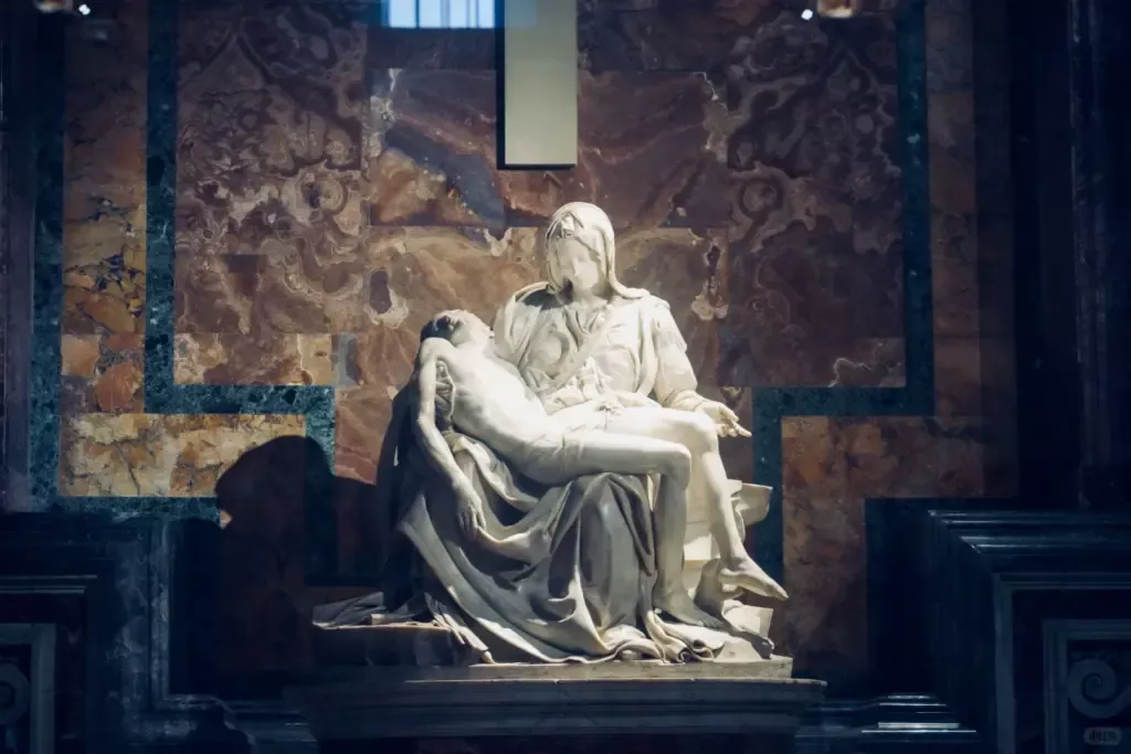 米开朗基罗完成《圣殇》时只有24 岁。在那个年龄完成这样规模、如此精细的解剖结构、布料褶皱与神情刻画,被认为是文艺复兴时期最惊人的成就之一。甚至当时很多人不相信这么年轻的人能做到,米开朗基罗才会破例在圣母胸带上刻下自己的名字——这是他一生中唯一一次在作品上签名。