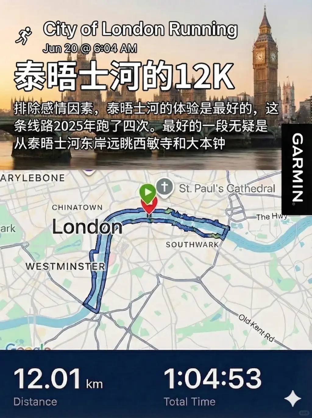 3️⃣ 六月去了🇬🇧,客观地说泰晤士河边的跑步体验是最好的。今年去了伦敦三趟,这条线路今年跑了四次。最经典的一段是从泰晤士河东岸眺望威斯敏斯特宫和大本钟,晨跑的时候人很少,阳光照在古老建筑上,风景绝美。