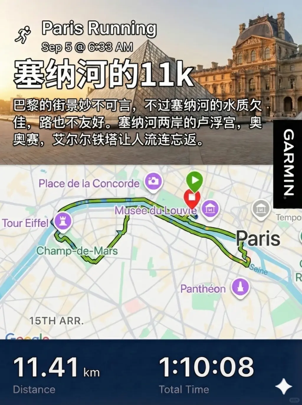 5️⃣ 九月去了🇫🇷,巴黎的街景妙不可言。卢浮宫,圣母院,奥赛博物馆,荣军院,还有🗼,这条线路都能涵盖。可惜塞纳河的水质欠佳,两岸的路面对跑者也不友好。不喜欢跑步的话,早点出门走一圈也行。