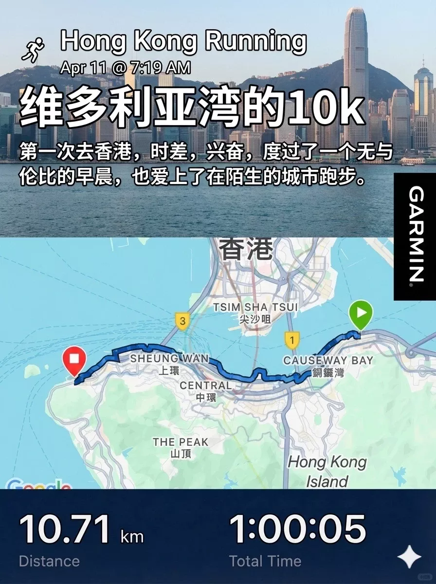 1️⃣ 25年4月休了一个月的长假,从🇭🇰转机回国。第二天上午,时差还没有倒过来,就沿着维多利亚湾跑了一个10k。那是我第一次在一个陌生的城市跑步,在无数滤镜下的香港度过了一个无与伦比的早晨。以前我不喜欢出远门,但是从此下决心去更多的城市旅行,并且每一个城市都跑一个10k。推荐大家去香港的时候有空跑一次,可能夜跑的感觉更好?