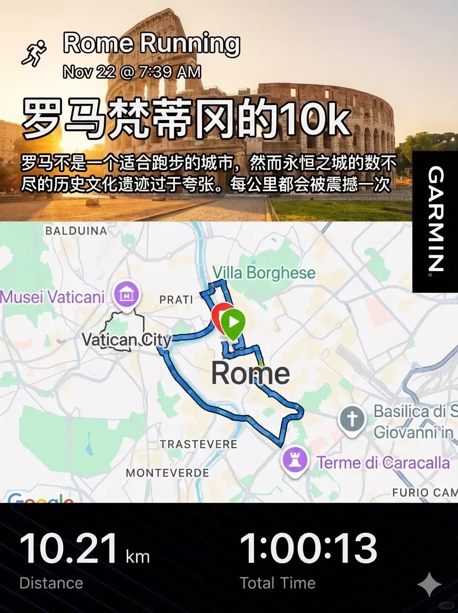 6️⃣ 感恩节期间去了🇮🇹,这条罗马梵蒂冈的线路论路况是最差的,可永恒之城的震撼无以复加。每一公里都会被忽然冒出的世界遗产震撼到,推荐在来罗马的第一天、参观任何景点之前先跑一次。