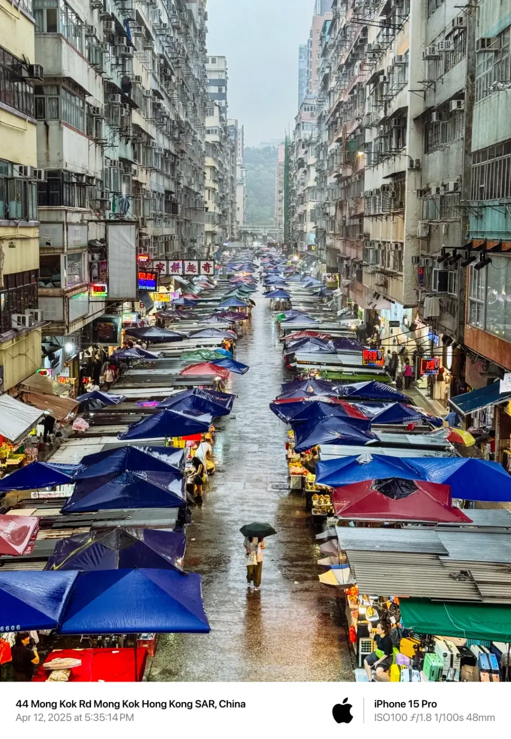 2️⃣ 旺角街市的打伞女孩。这是我去年最喜欢的照片,路过天桥的时候正下雨,觉得商铺的颜色很好看,于是拍了照片,当时根本没注意到路中间的姑娘,实属无心之作。xhs专门发过这张照片